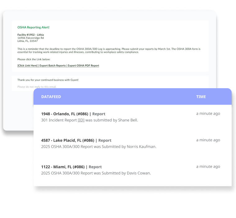 Quickly download reports or use our ITA-compatible batch file tools to submit your annual OSHA reports. Alternatively, let us handle the reporting for you, with notifications and alerts for filing deadlines to ensure you never miss a submission.